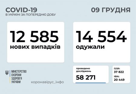 12 585 нових випадків коронавірусної хвороби COVID-19 зафіксовано в Україні станом на 9 грудня, повідомляє МОЗ. Зокрема, захворіли 654 дитини та 682 медпрацівники.