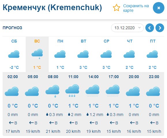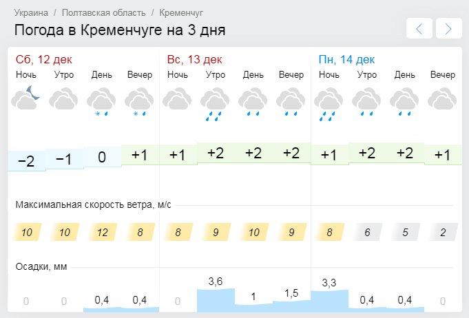 Gismeteo обещает, что дожди будут поливать Кременчуг почти все выходные и продолжатся также в понедельник, 14 декабря. Градусники покажут от -2°С до +2°С.