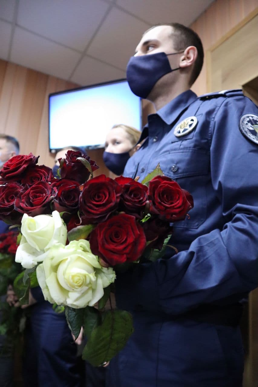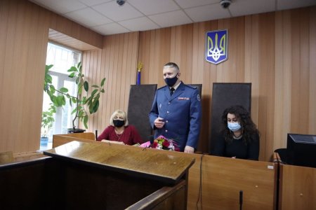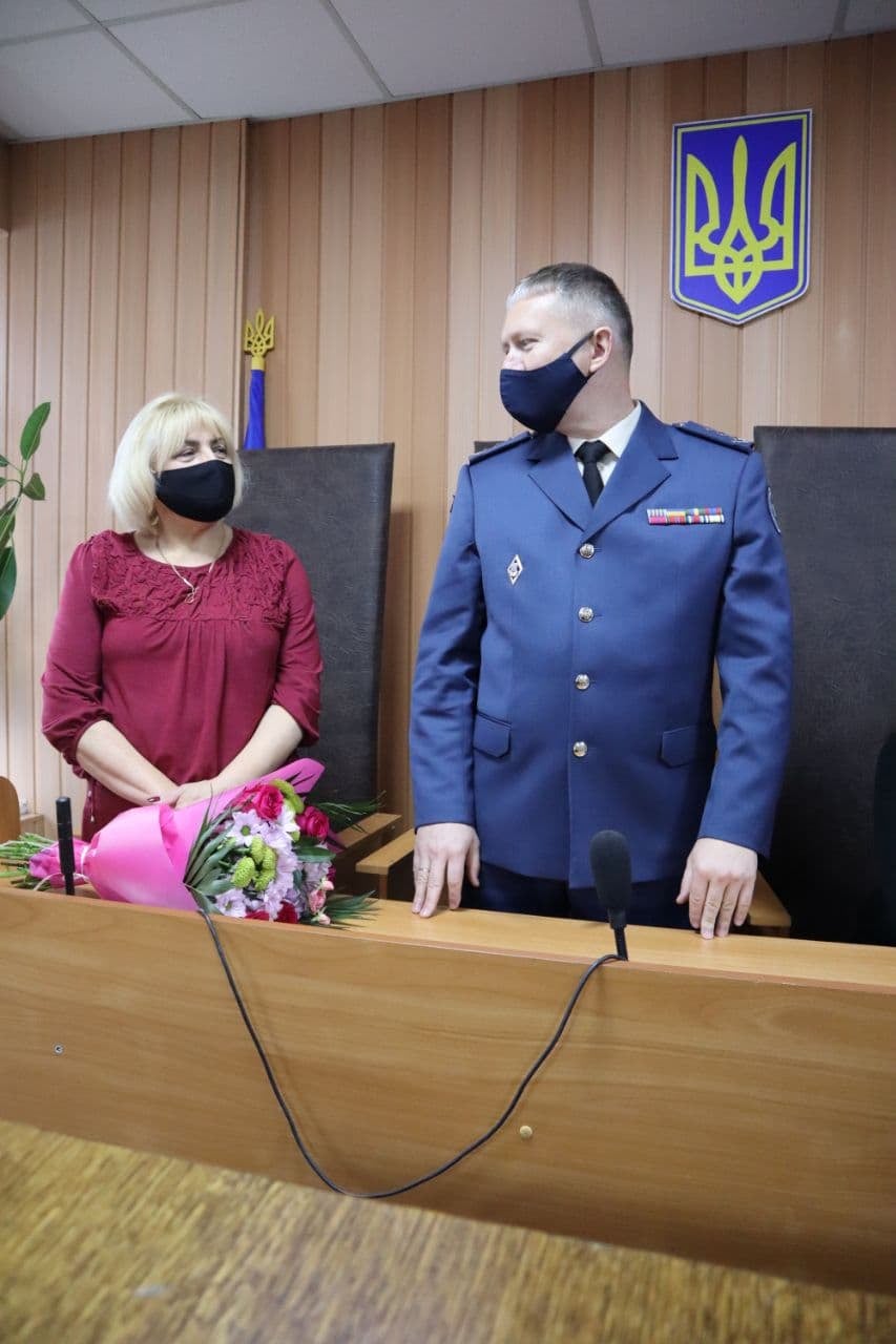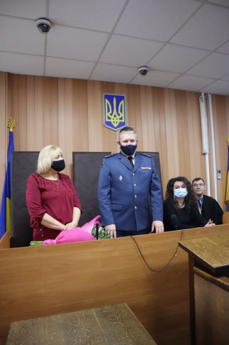 Начальник судових охоронців Полтавщини полковник Служби Олександр Аленін вручив голові суду Світлані Клименко символічний знак Служби, а також представив колектив охоронців Феміди, які відтепер забезпечуватимуть громадський порядок у судовій установі.