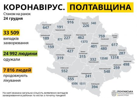 За інформацією Полтавського обласного лабораторного центру МОЗ України, за минулу добу на Полтавщині зареєстрували нових випадків – 564. Одужали 24 992 (+713) жителі області, продовжують лікування 7 816 людей, зокрема, 172 дитини.