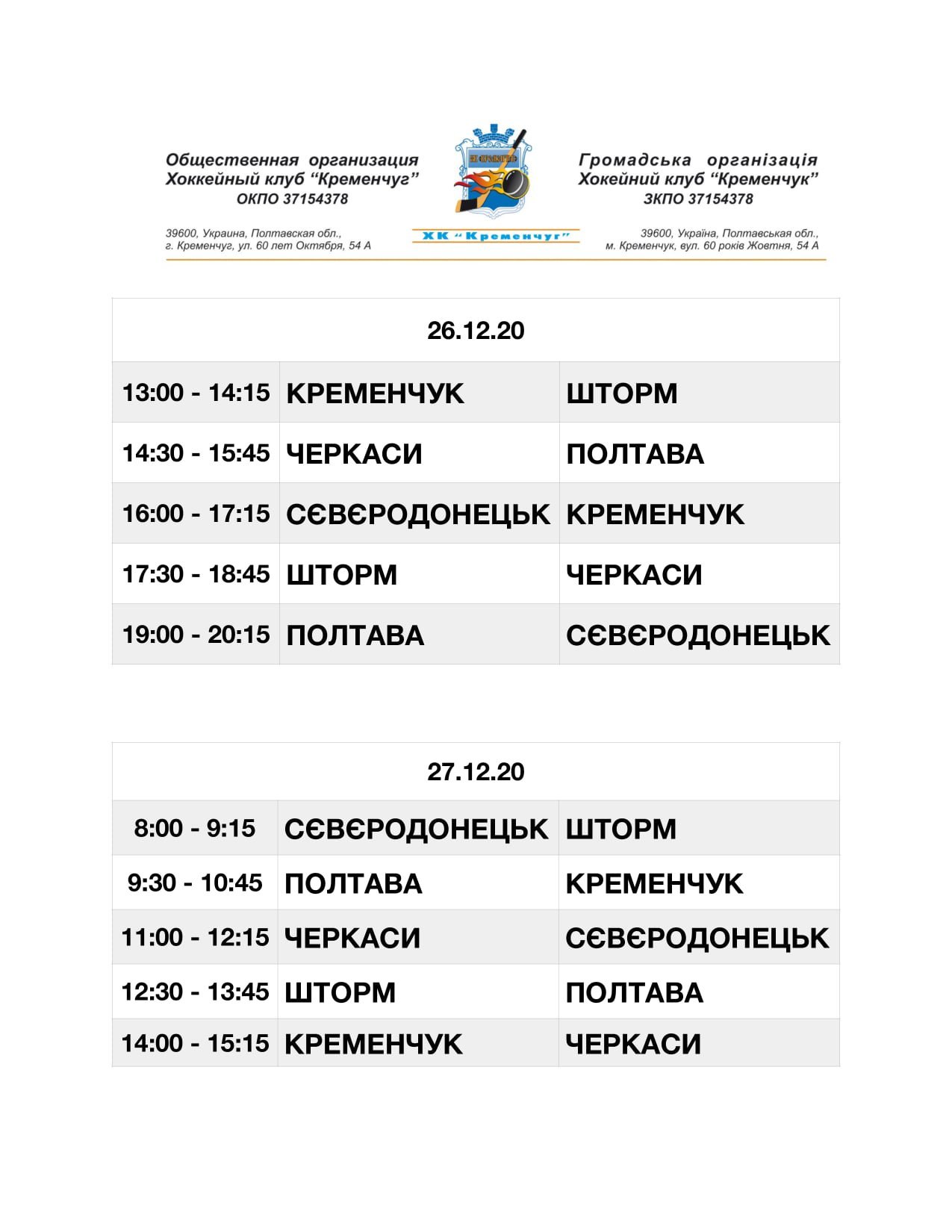 26 – 27 грудня на арені «Айсберг» проходить Новорічний турнір з хокею серед аматорський команд. У ньому змагаються п’ять команд: «Кременчук», «Шторм», «Черкаси», «Полтава» та «Сєвєродонецьк». Про це повідомляє пресслужба хокейного клубу Кременчук.