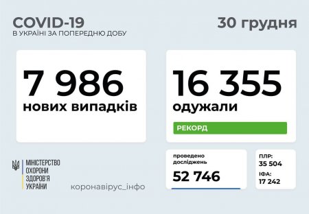 7 986 нових випадків коронавірусної хвороби COVID-19 зафіксовано в Україні станом на 30 грудня, повідомляє МОЗ. Зокрема, захворіли 272 дитини та 453 медпрацівники.
