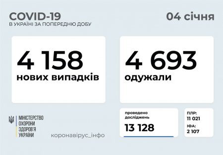 4 158 нових випадків коронавірусної хвороби COVID-19 зафіксовано в Україні станом на 4 січня 2021 року. Зокрема, захворіли 170 дітей та 163 медпрацівники.