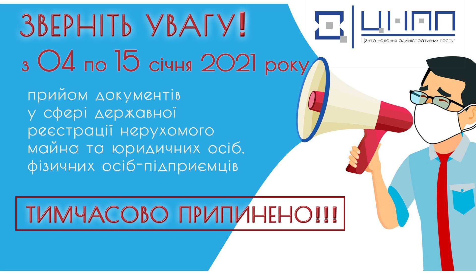 З 4 до 15 січня тимчасово призупинено прийом документів у сфері державної реєстрації нерухомого майна та юридичних осіб, фізичних осіб-підприємців. Про це повідомляє пресслужба ЦНАПу з посиланням на Департамент державної реєстрації виконавчого комітету Кременчуцької міської ради Кременчуцького району Полтавської області.