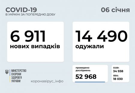 6 911 нових випадків коронавірусної хвороби COVID-19 зафіксовано в Україні станом на 6 січня, повідомляє МОЗ. Зокрема, захворіли 203 дитини та 406 медпрацівників.