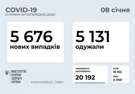 5 676 нових випадків коронавірусної хвороби COVID-19 зафіксовано в Україні станом на 8 січня 2021 року. Зокрема, захворіли 166 дітей та 179 медпрацівників.