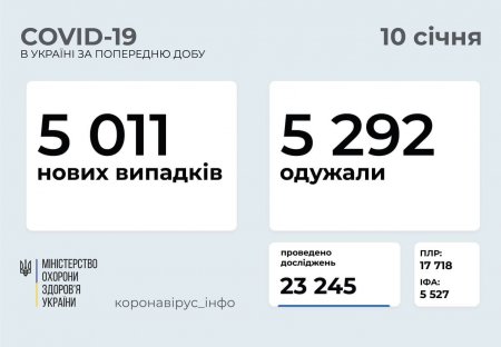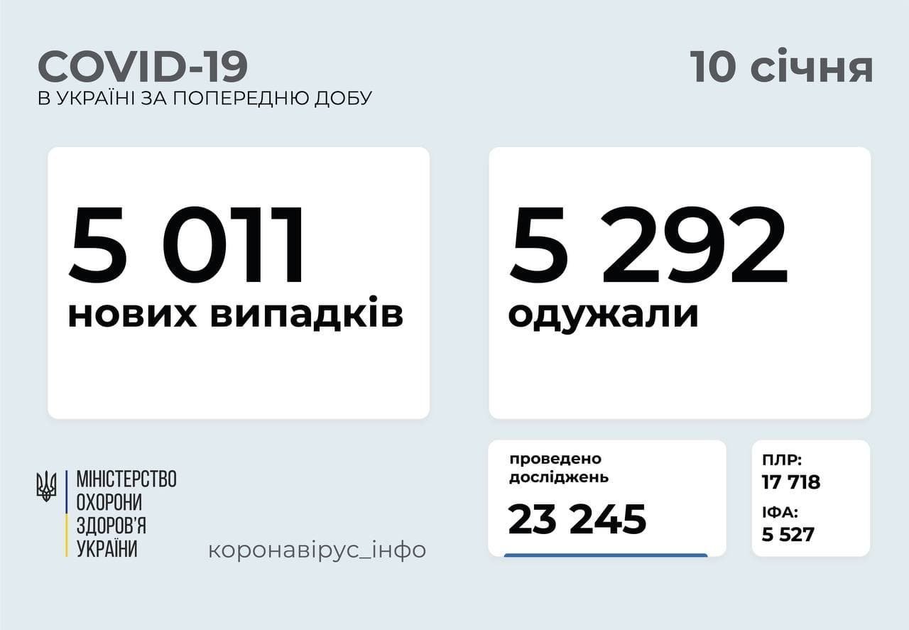5 011 нових випадків коронавірусної хвороби COVID-19 зафіксовано в Україні станом на 10 січня 2021 року. Зокрема, захворіли 113 дітей та 164 медпрацівники.