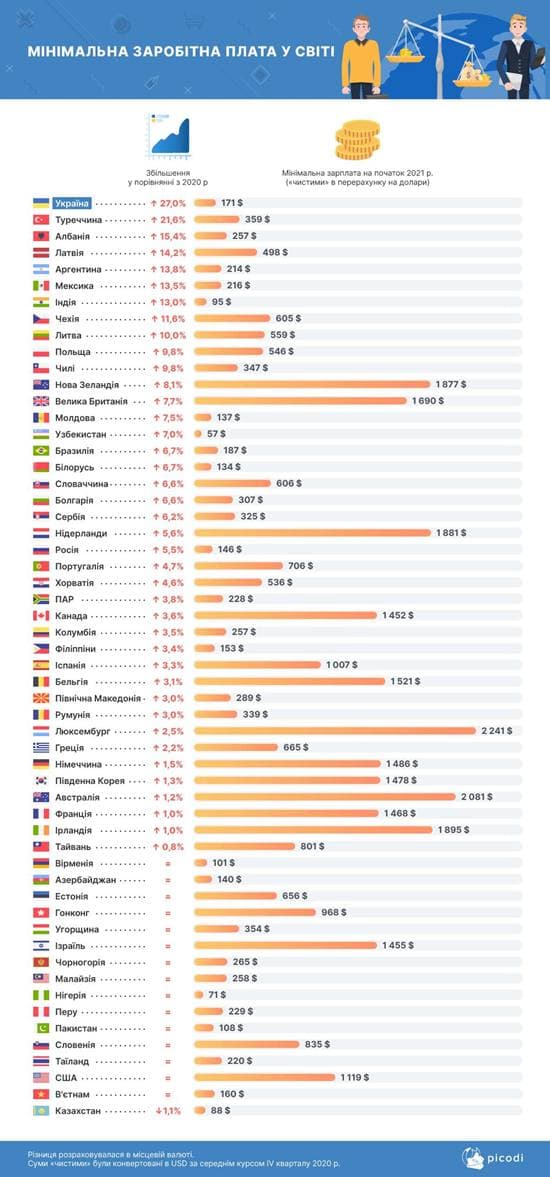 Зазначається, що станом на січень поточного року, «мінімалка» в Україні становить $171, що менше, ніж у більшості інших країн, наприклад, в Туреччині, яка перебуває на другому місці рейтингу. Однак, зростання «чистої» мінімальної зарплати виявилося найбільшим у порівнянні із минулим роком – із 3 802 гривень до 4 830.