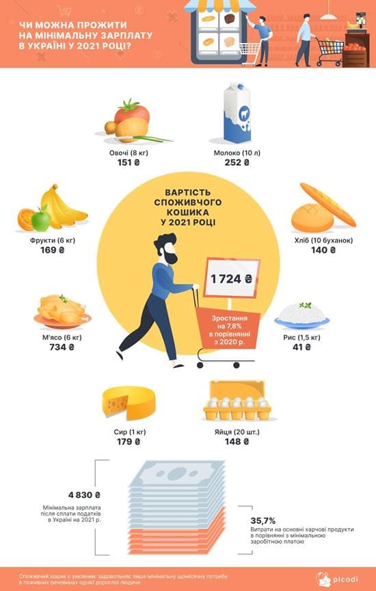 Також повідомляється, що вартість мінімального продуктового кошика на початок 2021 року становить 1 724 грн., що на 7,82% більше, ніж рік тому.