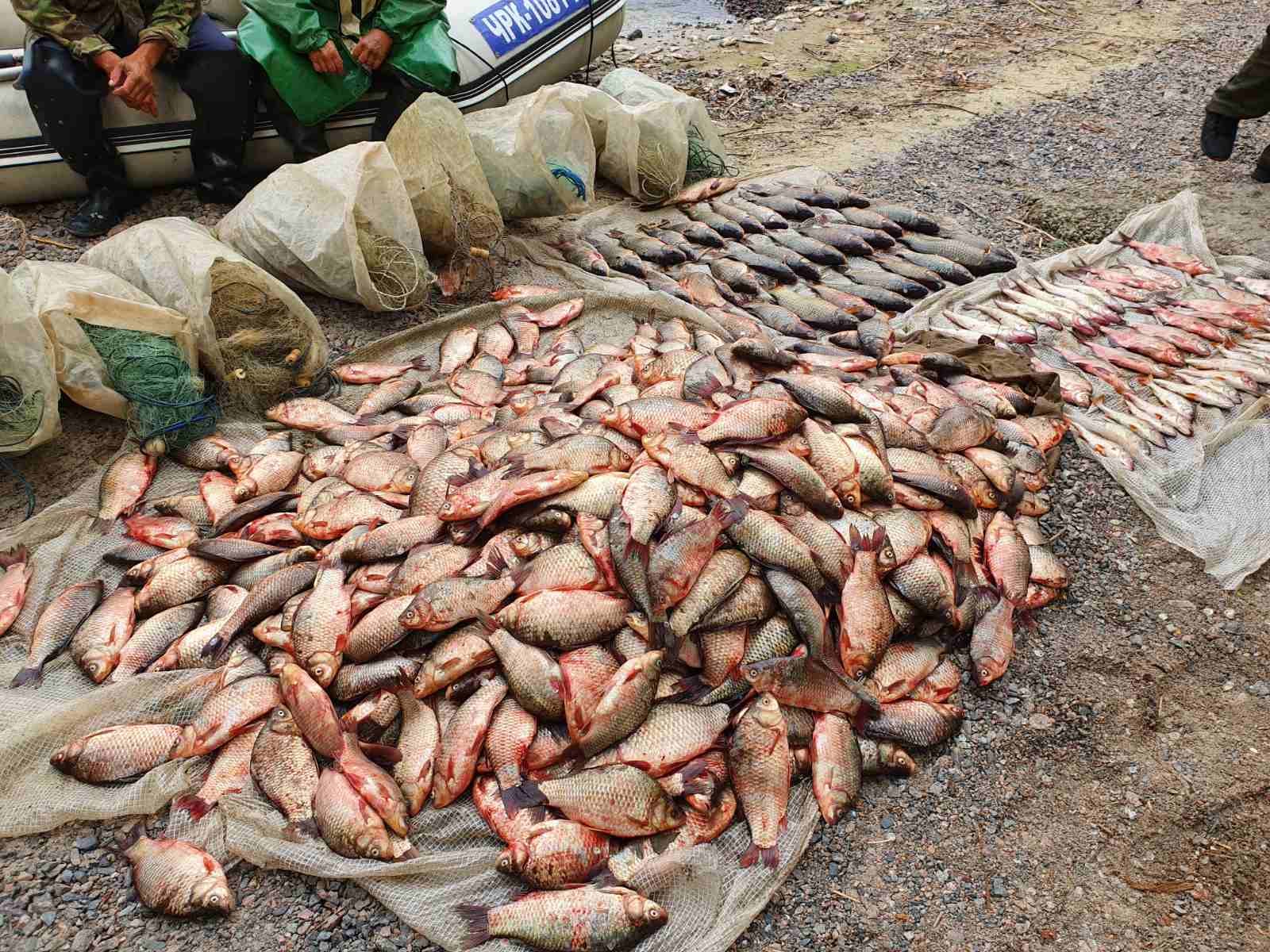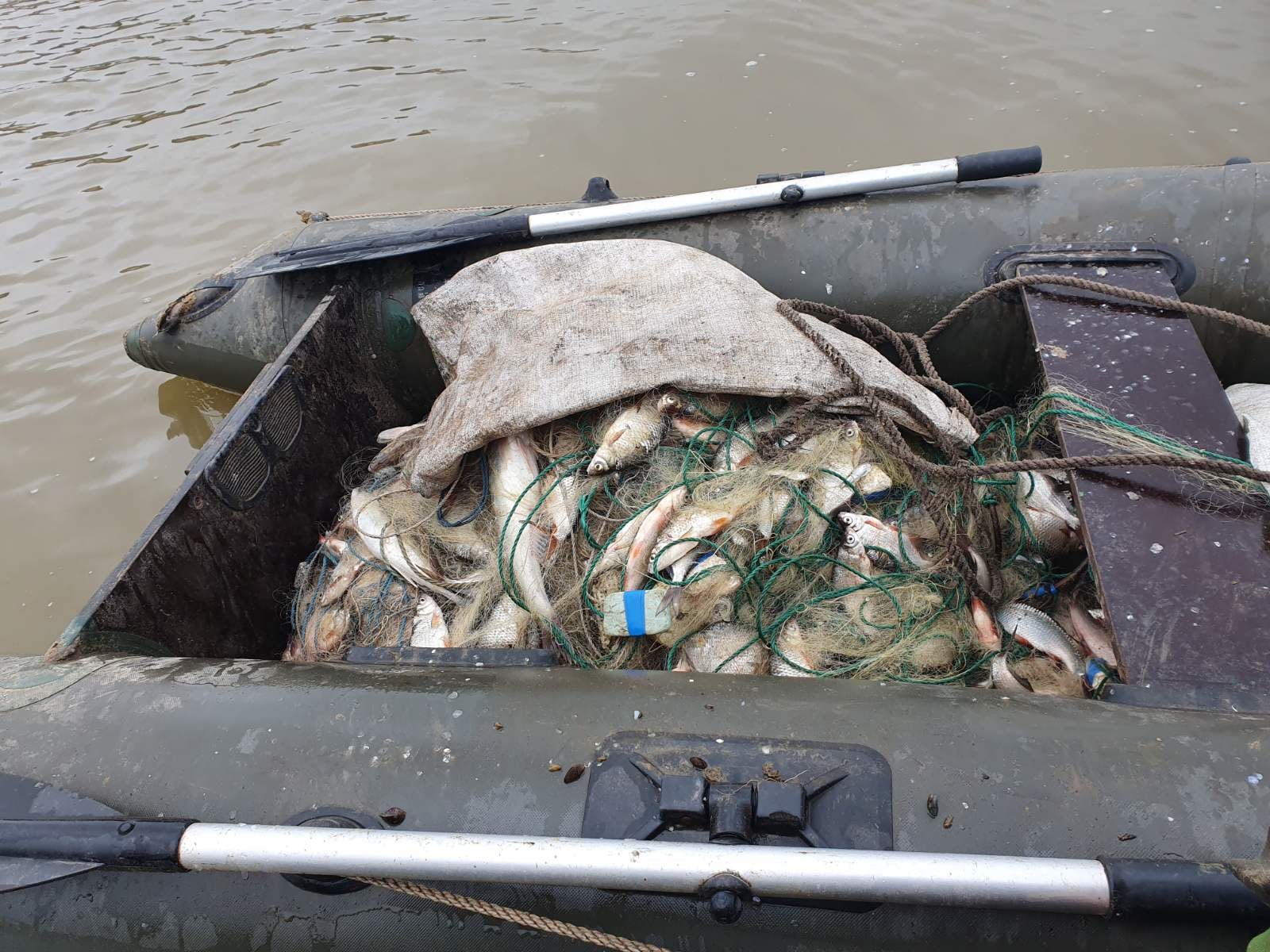 Двоє громадян здійснювали незаконний вилов водних біоресурсів з гумового човна за допомогою 16 мисинових сіток. При перевірці мобільна група виявила 198 кг риби, а саме: карась сріблястий – 634 екз., сазан – 34 екз., лящ – 17 екз., судак – 8 екз. та синець – 7 екз.