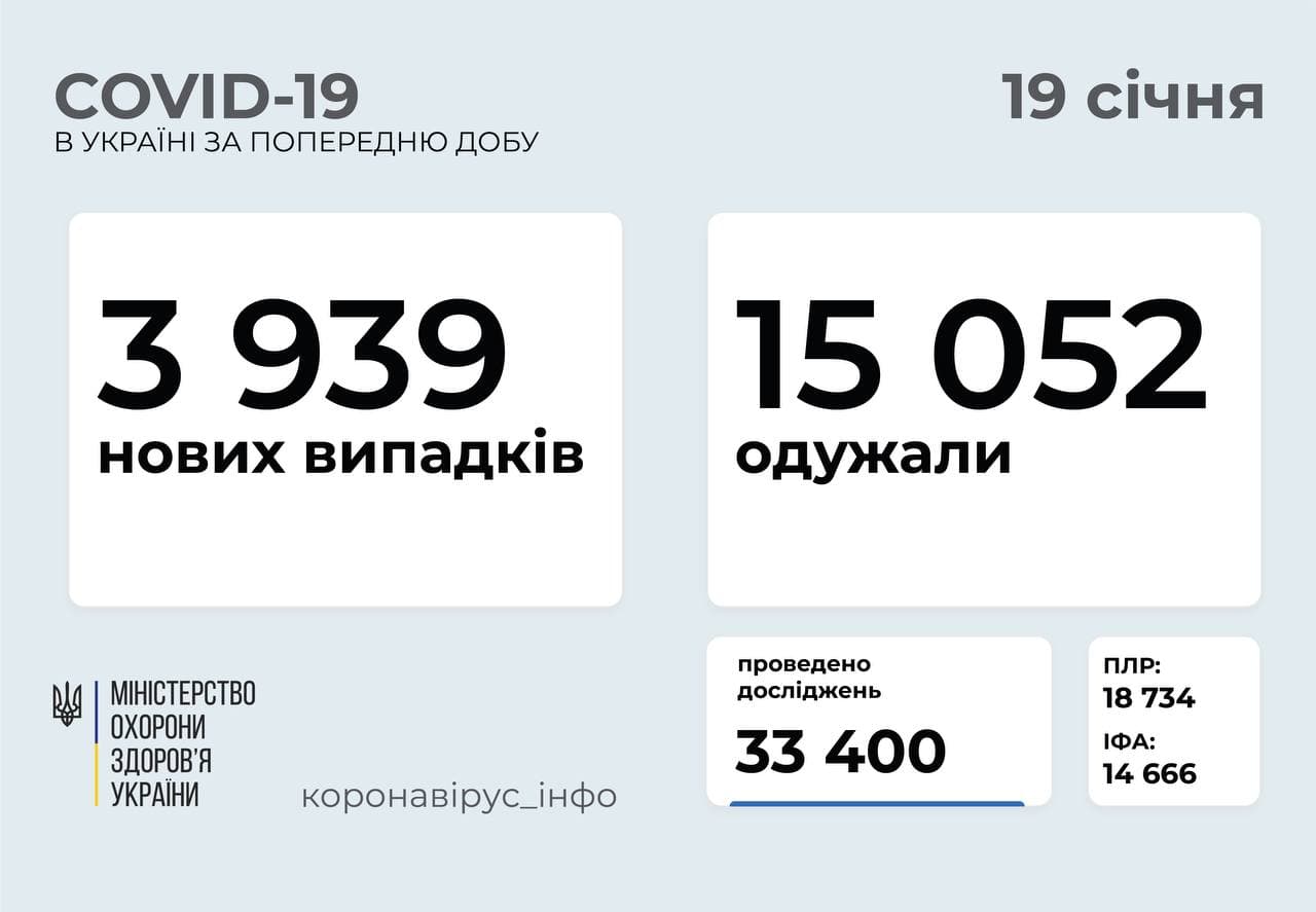3 939 нових випадків коронавірусної хвороби COVID-19 зафіксовано в Україні станом на 19 січня, повідомляє МОЗ. Зокрема, захворіли 131 дитина та 238 медпрацівників.