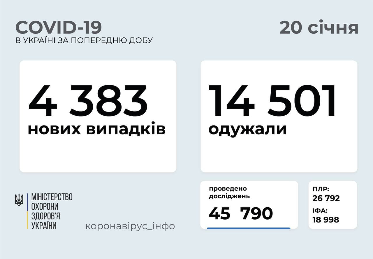 4 383 нових випадки коронавірусної хвороби COVID-19 зафіксовано в Україні станом на 20 січня, повідомляє МОЗ. Зокрема, захворіли 161 дитина та 239 медпрацівників.