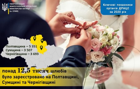 За словами начальника Північно-Східного міжрегіонального управління Міністерства юстиції (м. Суми) Ірини Свистун, відповідаючи викликам сьогодення та дотримуючись всіх карантинних обмежень, фахівці юстиції минулого року продовжували надавати громадянам послуги з реєстрації шлюбу. У середньому по трьох областях на кожен день приходило по 34 весілля.
