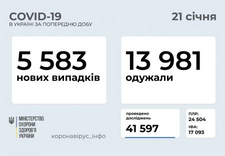5 583 нових випадки коронавірусної хвороби COVID-19 зафіксовано в Україні станом на 21 січня, повідомляє МОЗ. Зокрема, захворіли 173 дитини та 229 медпрацівників.