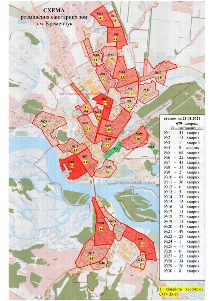 За інформацією управління з питань НС та ЦЗН виконкому міської ради, станом на 21 січня у Кременчуці зареєстровано 679 випадків захворювання на COVID-2019. За місцем проживання хворих із цим діагнозом встановлено 29 карантинних зон.