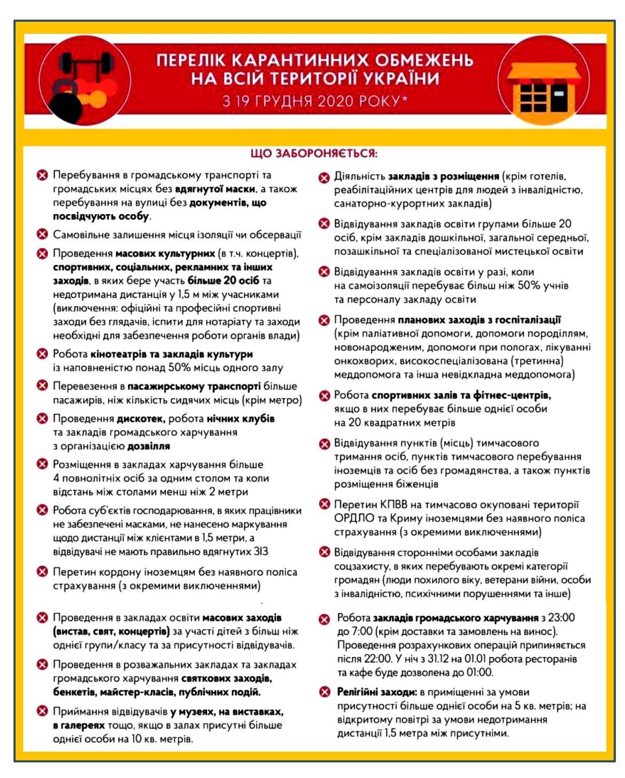 Нагадаємо, на позачерговому засіданні 9 грудня Уряд затвердив рішення про продовження карантину до 28 лютого 2021 року з посиленням обмежень на період з 8 до 24 січня. В період з 00.00 8 січня 2021 року до 00.00 годин 25 січня на території України діють посилені карантинні заходи.