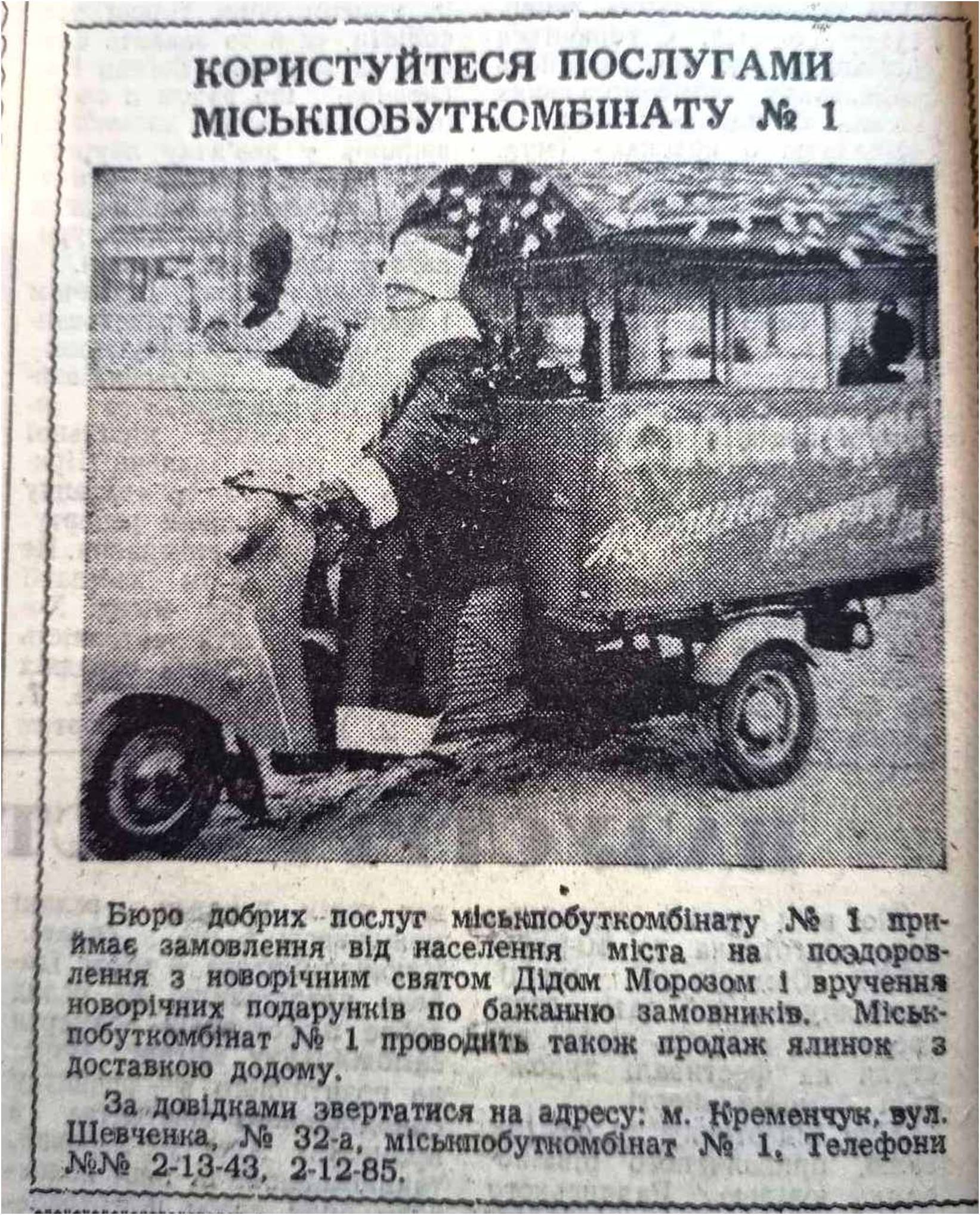 Ця досить цікава організація, яка приносила новорічну радість, знаходилася по вул. Шевченка, 32-а. Такого активного веселого Діда Мороза запрошували по кременчуцьких домівках протягом всіх святкових днів аж до самого «Старого Нового року»., – йдеться у матеріалі Кременчуцького краєзнавчого музею.