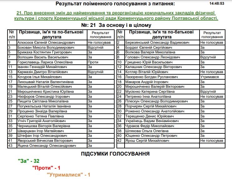Перед початком голосування депутатка Лариса Гориславець звернула увагу, що раніше влада була за створення безлічі адміністрацій парків, для кращої організації роботи, а зараз намагається скоротити кількість спортивних шкіл шляхом об'єднання.