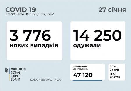 3 776 нових випадків коронавірусної хвороби COVID-19 зафіксовано в Україні станом на 27 січня 2021 року. Зокрема, захворіли 115 дітей та 172 медпрацівники.