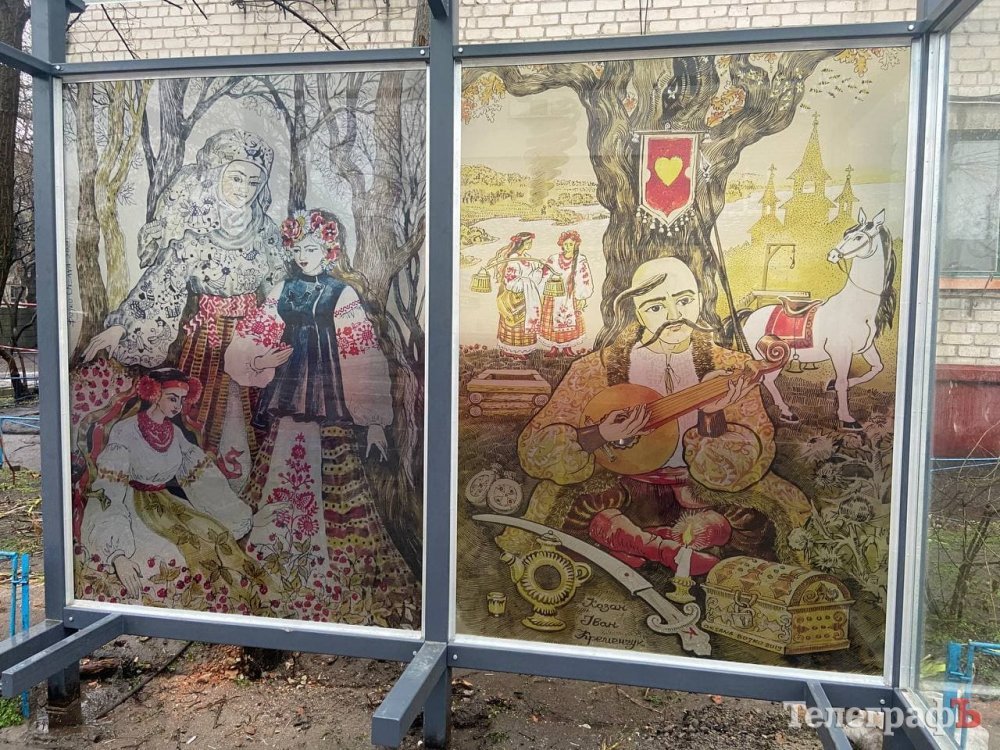 По-перше, там встановили павільйон очікування, а по-друге, на його склі з’явилося зображення жінки та двох дівчат в національних українських вбраннях, а також козака Івана Кременчука.