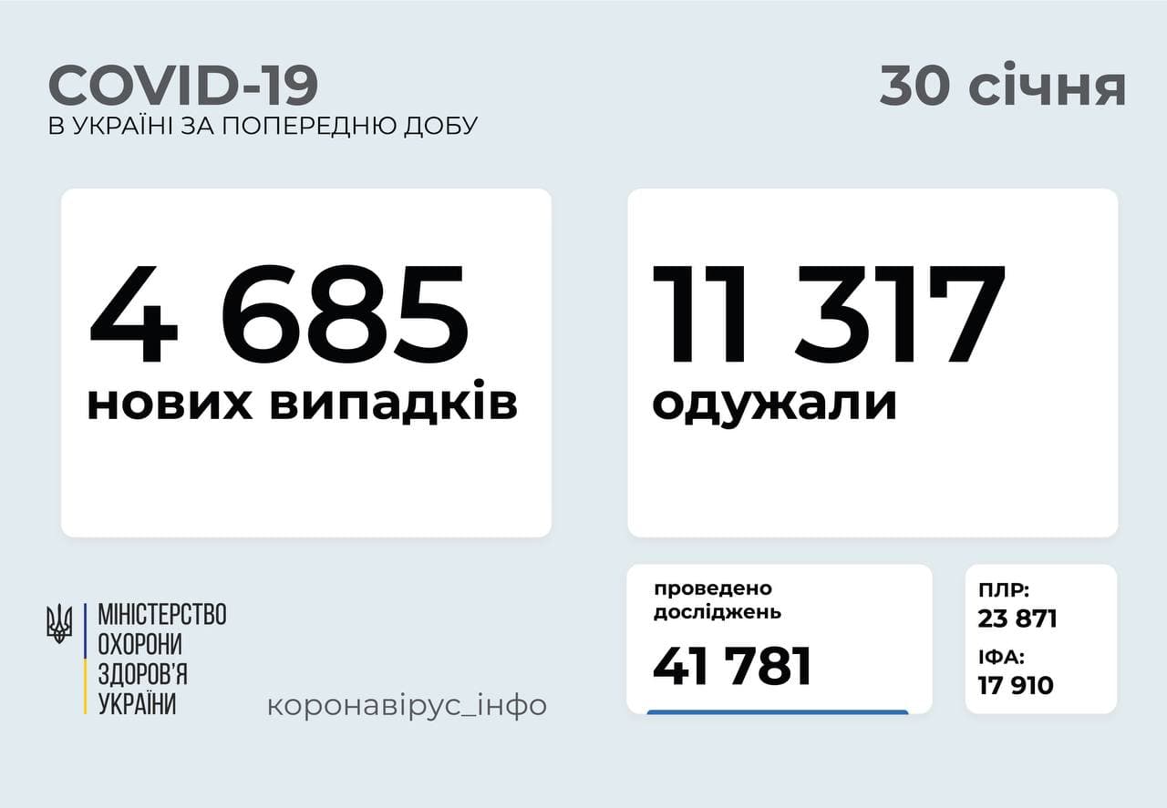 4 685 нових випадків коронавірусної хвороби COVID-19 зафіксовано в Україні станом на 30 січня 2021 року. Зокрема, захворіли 200 дітей та 336 медпрацівників.