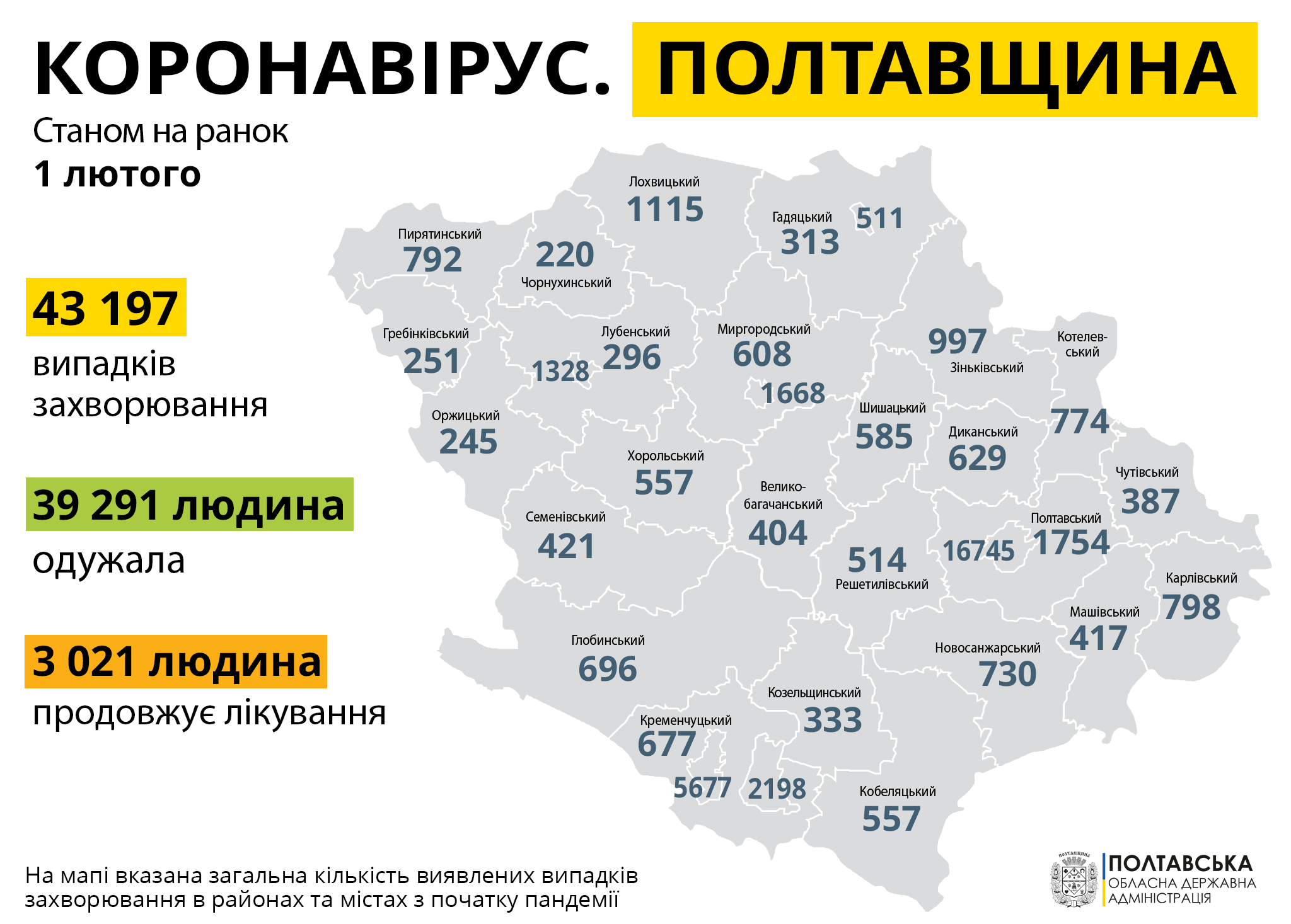 За інформацією Полтавського обласного лабораторного центру МОЗ України, від початку карантину на Полтавщині діагностували 43 197 випадків захворювання на COVID-19.