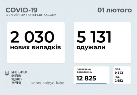 2 030 нових випадків коронавірусної хвороби COVID-19 зафіксовано в Україні станом на 1 лютого, повідомляє Міністерство охорони здоров'я України.