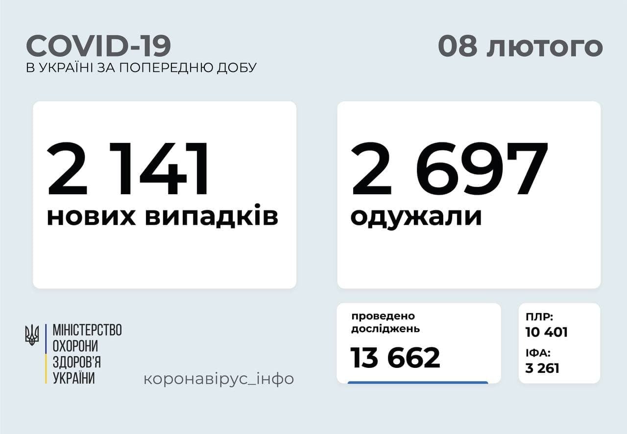 2 141 новий випадок коронавірусної хвороби COVID-19 зафіксовано в Україні станом на 8 лютого 2021 року, повідомляє Міністерство охорони здоров’я України. Зокрема, захворіли 130 дітей та 71 медпрацівник.