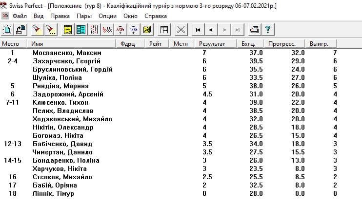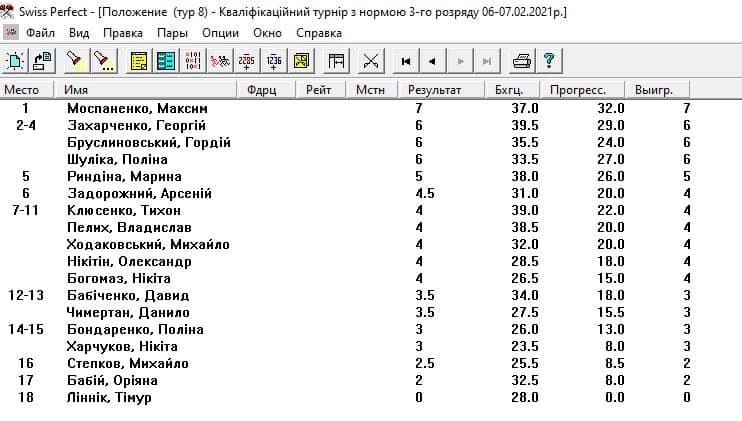 Золото турніру завоював Максим Моспаненко (7 з 8 очок) – блискучий результат. Далі двоє учасників набрали однакову кількість очків. За додатковими показниками наступні місця такі: 2 місце – Георгій Захарченко (6 з 8 очок), а 3 місце – Гордій Бруслиновський (6 з 8). На 4 місці та кращий результат серед дівчат – Поліна Шуліка (6 з 8 очок).