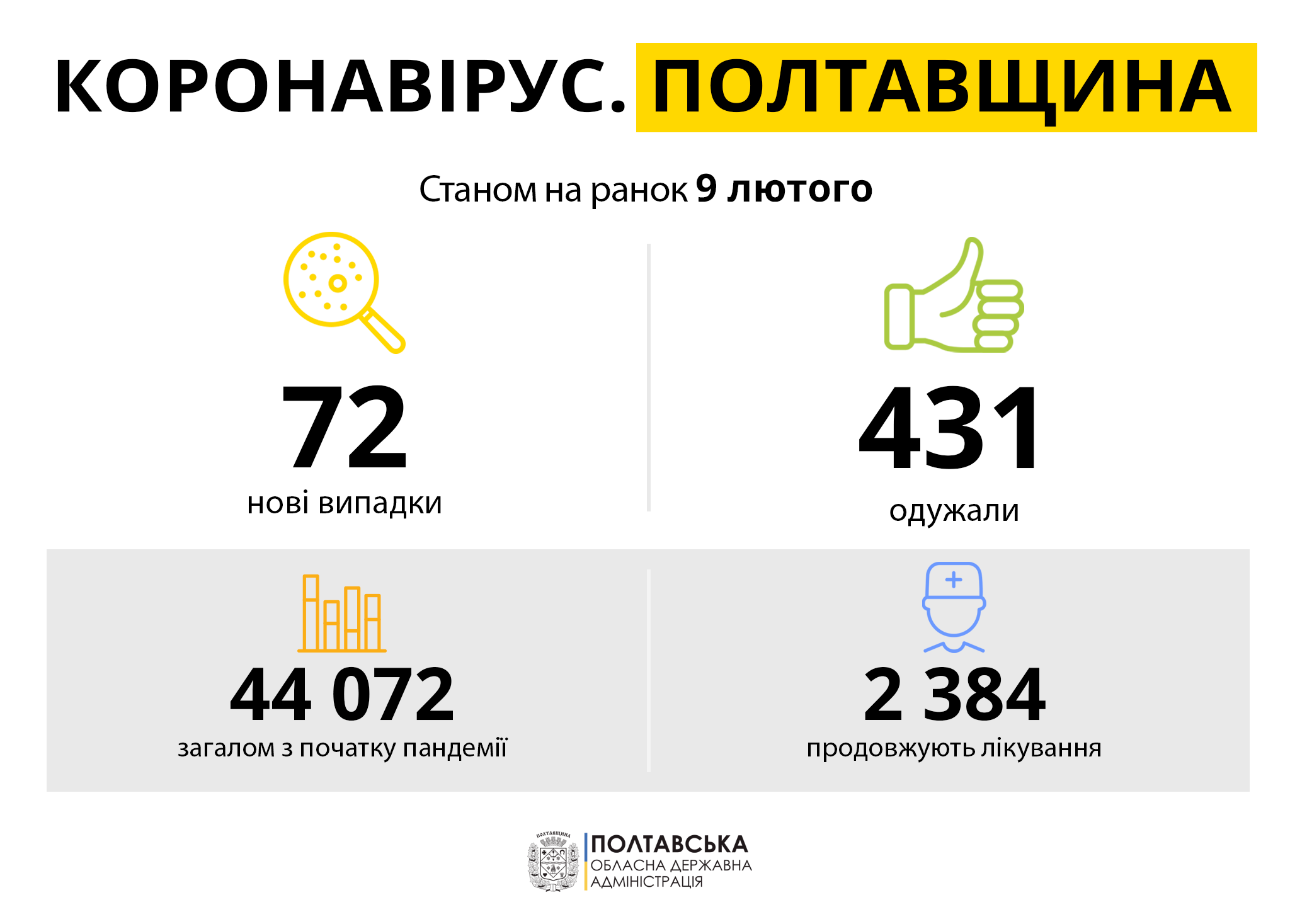 Від початку карантину на Полтавщині діагностували 44 072 випадки захворювання на COVID-19.