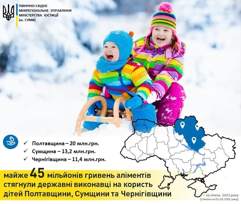 Зокрема, на Полтавщині діти отримали майже 20 млн грн, на Сумщині – більше 13 млн грн та понад 11 млн грн аліментів сплатили батьки на Чернігівщині.