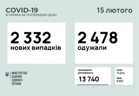 2 332 нові випадки коронавірусної хвороби COVID-19 зафіксовано в Україні станом на 15 лютого 2021 року, повідомляє Міністерство охорони здоров'я України.