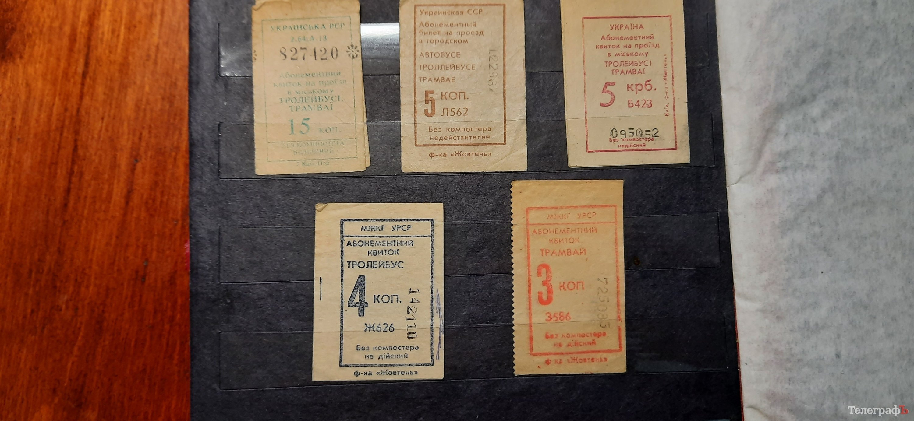 Читач Анатолій надав світлину з квитками у кременчуцькому транспорті. Так талончик за 15 коп, за 4 та 5 коп (ходив за маршрутом №6 Героїв Бреста – ринок) кременчуцькі, інші квитки з київського транспорту.