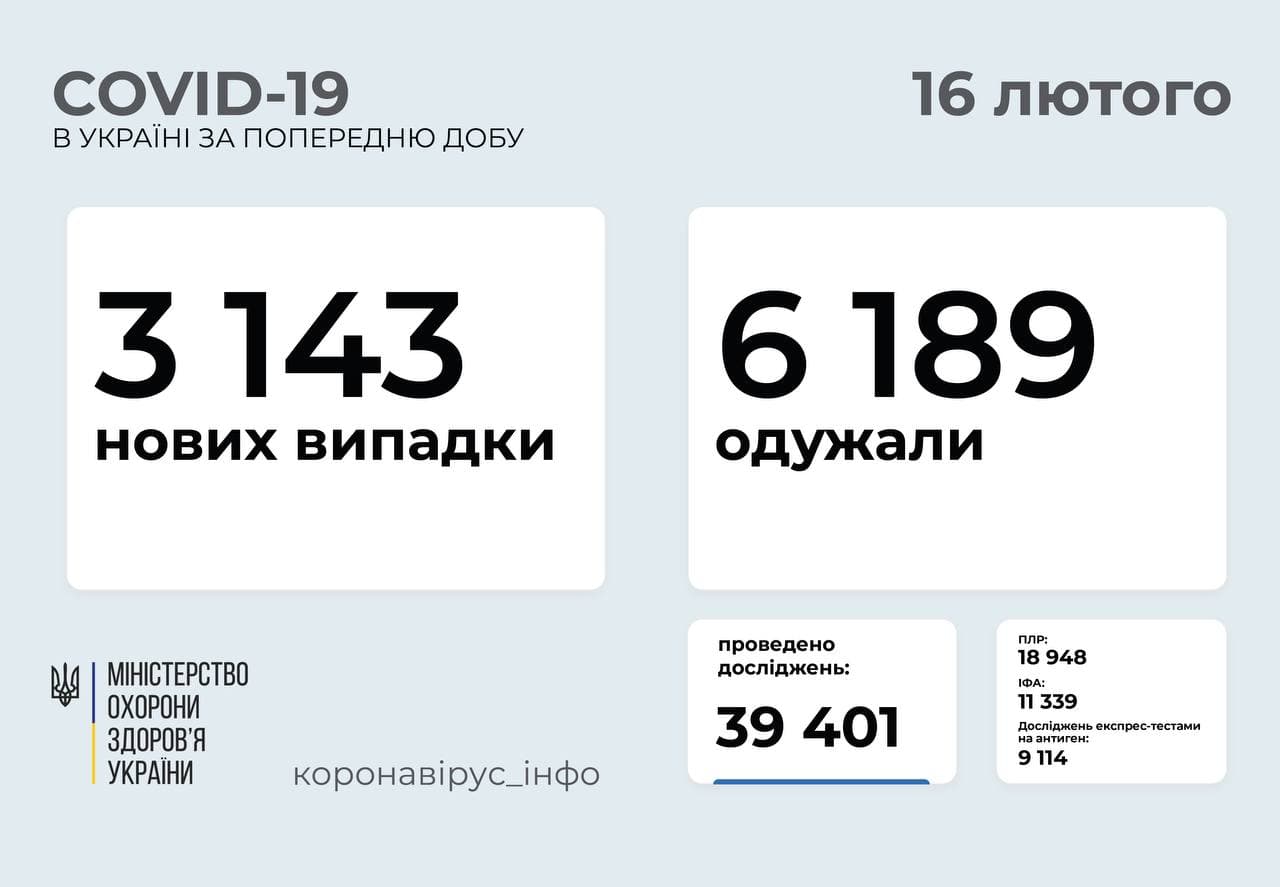 3 143 нових випадки коронавірусної хвороби COVID-19 зафіксовано в Україні станом на 16 лютого, повідомляє МОЗ. Зокрема, захворіли 182 дитини та 179 медпрацівників.