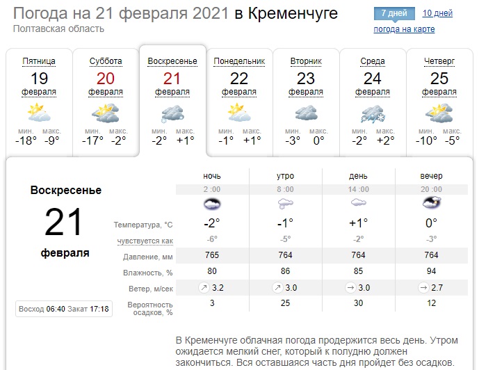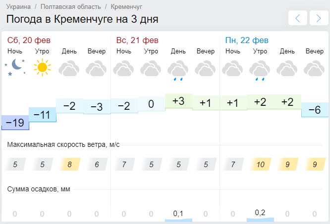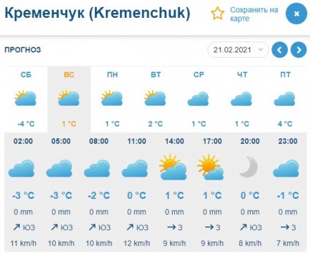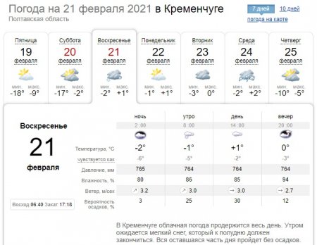 По прогнозам Sinoptik, в субботу, 20 февраля, утром температура может упасть до -17°С, но днём потеплеет до -2°С. А в воскресенье, 21 февраля, до всех +2°С. В целом в Кременчуге на уикенд продержится пасмурная погода с кратковременными прояснениями, в воскресенье утром город припорошит мелким снегом.