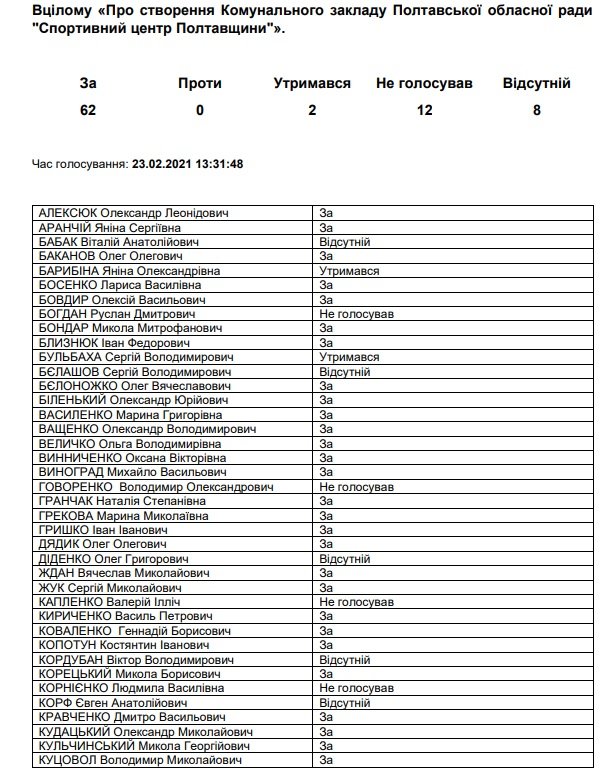 За цей час Тарас Захарченко, як уповноважена особа, має підготувати проєкт Статуту та подати його на затвердження управлінню майном обласної ради. Також необхідно здійснити державну реєстрацію створення Комунального закладу Полтавської обласної ради «Спортивний центр Полтавщини» у відповідності з вимогами законодавства.
