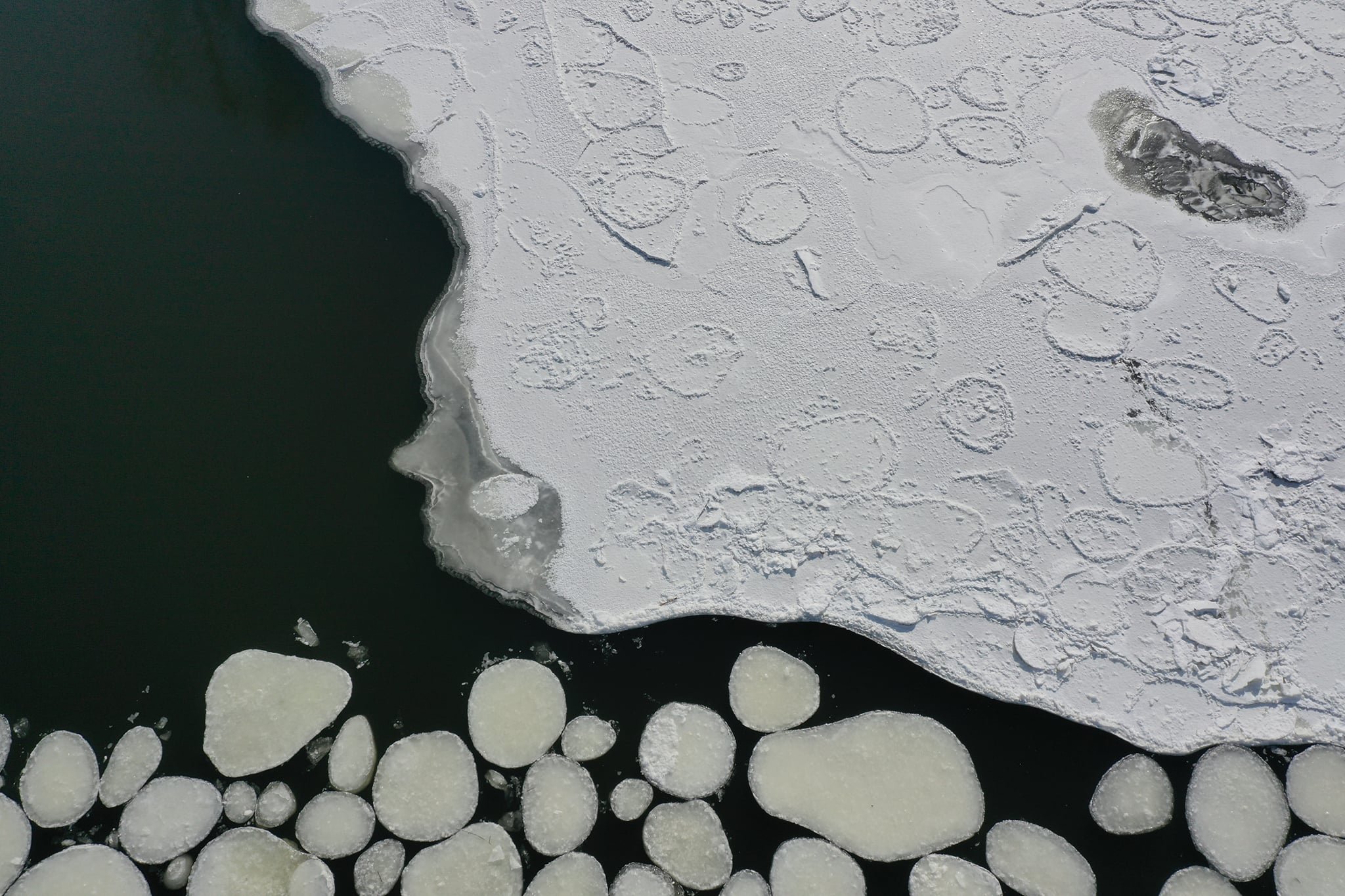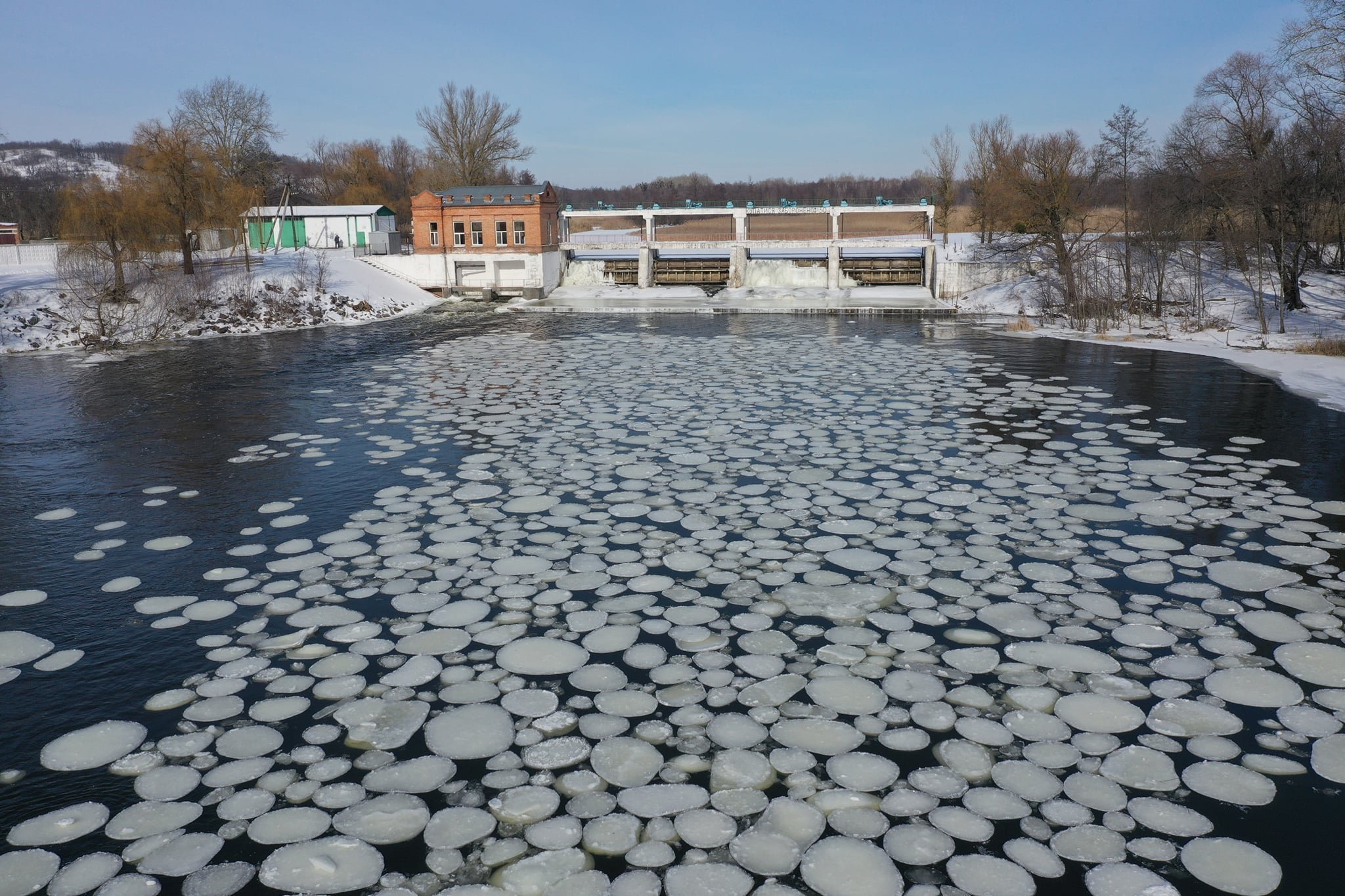 Біля ГЕС села Міські Млини на р. Ворскла утворилися дивовижні крижані кружальця, які вкрили воду, ніби мозаїка.