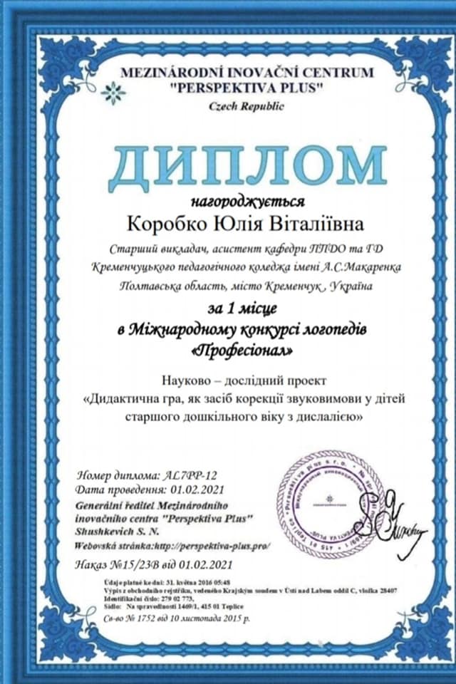 Викладачка та студентка Кременчуцького педагогічного коледжу імені А.С. Макаренка зі своїм проєктом зайняли перше місце на Міжнародному конкурсі логопедів «Актуальний логопед». Про це мовиться на сторінці педколеджу у фейсбуці.