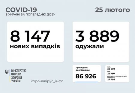 8 147 нових випадків коронавірусної хвороби COVID-19 зафіксовано в Україні станом на 25 лютого 2021 року, повідомляє Міністерство охорони здоров'я України. Зокрема, захворіли 483 дитини та 301 медпрацівник.