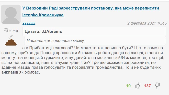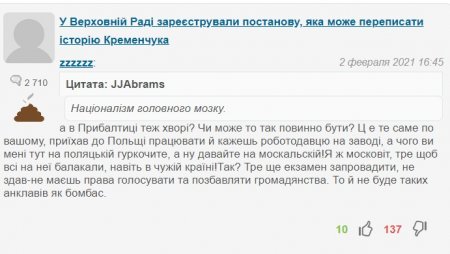 Найбільше «не зайшли» читачам коментарі zzzzzz. Його коментарям також присвоєний відповідний значок. За лютий він написав усього 101 коментар і примудрилася зібрати ними 1549 дизлайків. Ось коментар, який не сподобався іншим найбільше: