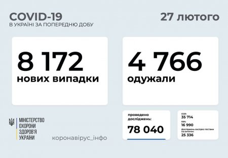 8172 нових випадки коронавірусної хвороби COVID-19 зафіксовано в Україні станом на 27 лютого 2021 року. Зокрема, захворіли 519 дітей та 292 медпрацівники.