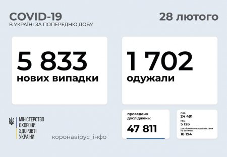 5833 нових випадки коронавірусної хвороби COVID-19 зафіксовано в Україні станом на 28 лютого 2021 року. Зокрема, захворіли 795 дітей та 146 медпрацівників.