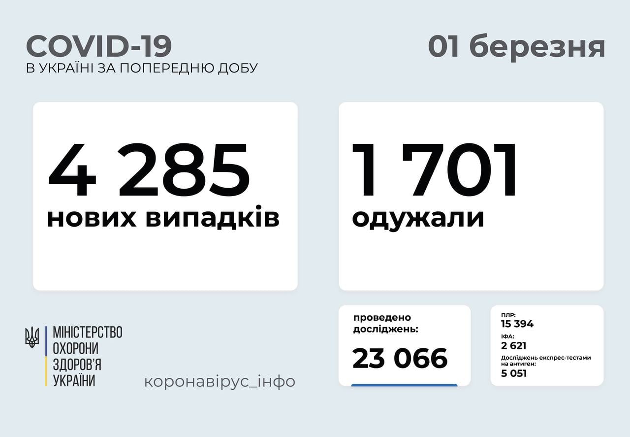 4 285 нових випадків коронавірусної хвороби COVID-19 зафіксовано в Україні станом на 01 березня 2021 року, повідомляє Міністерство охорони здоров’я України. Зокрема, захворіли 258 дітей та 93 медпрацівники.