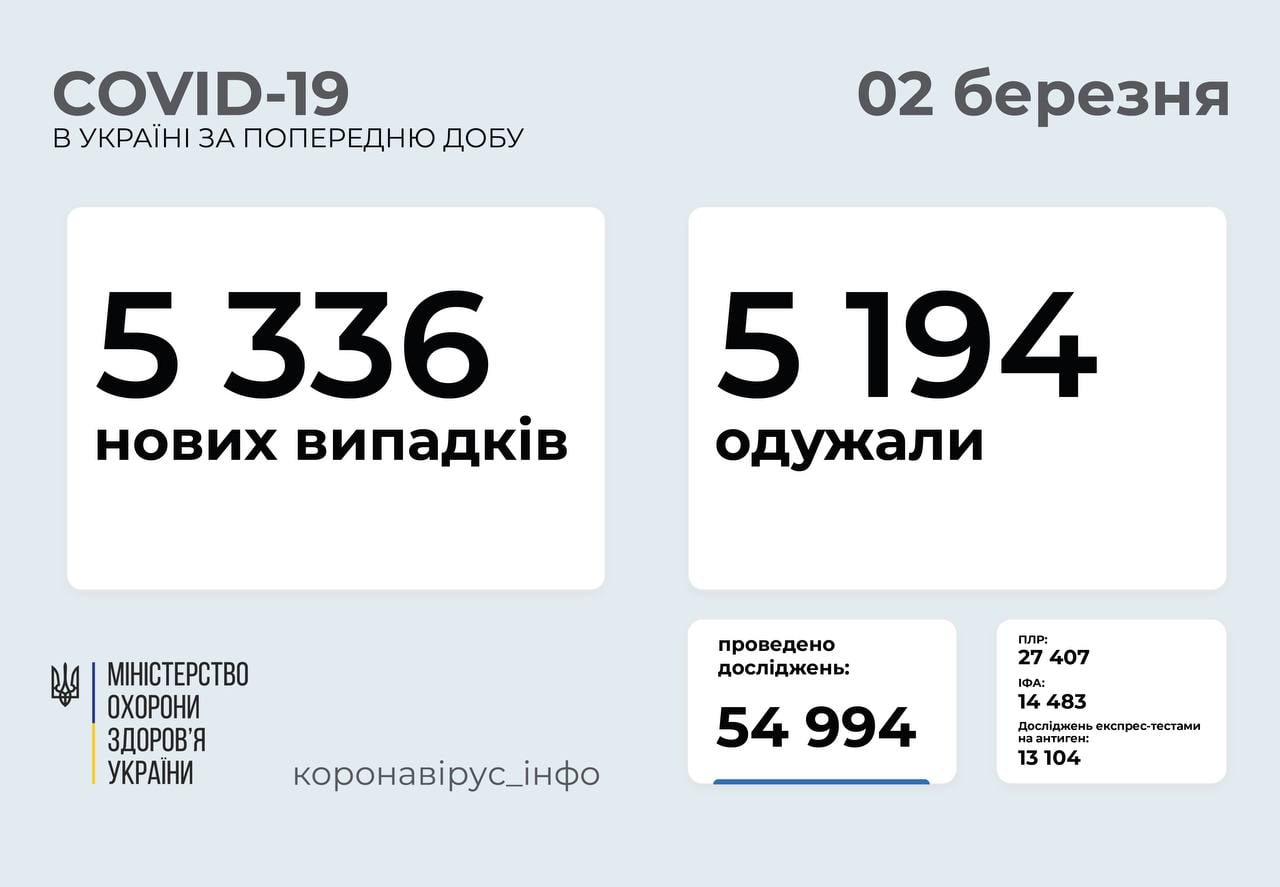 5 336 нових випадків коронавірусної хвороби COVID-19 зафіксовано в Україні станом на 2 березня 2021 року, повідомляє Міністерство охорони здоров’я України. Зокрема, захворіли 308 дітей та 218 медпрацівників.
