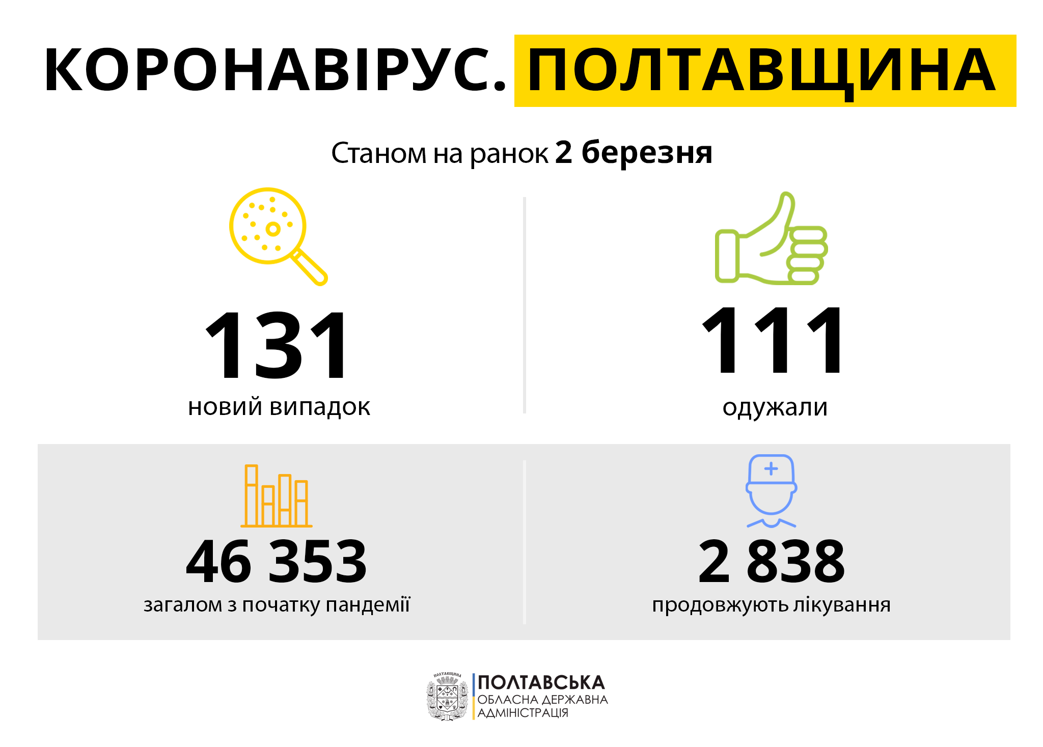 Від початку карантину на Полтавщині діагностували 46 353 випадки захворювання на COVID-19. Одужали 42 532 жителі області, продовжують лікування 2 838 людей, зокрема 132 дитини.