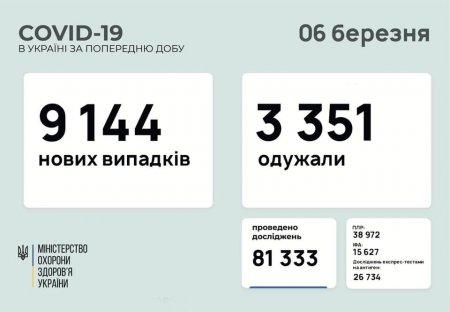 9 144 нові випадки коронавірусної хвороби COVID-19 зафіксовано в Україні станом на 06 березня 2021 року, повідомляє Міністерство охорони здоров'я України. Зокрема, захворіли 563 дитини та 299 медпрацівників.