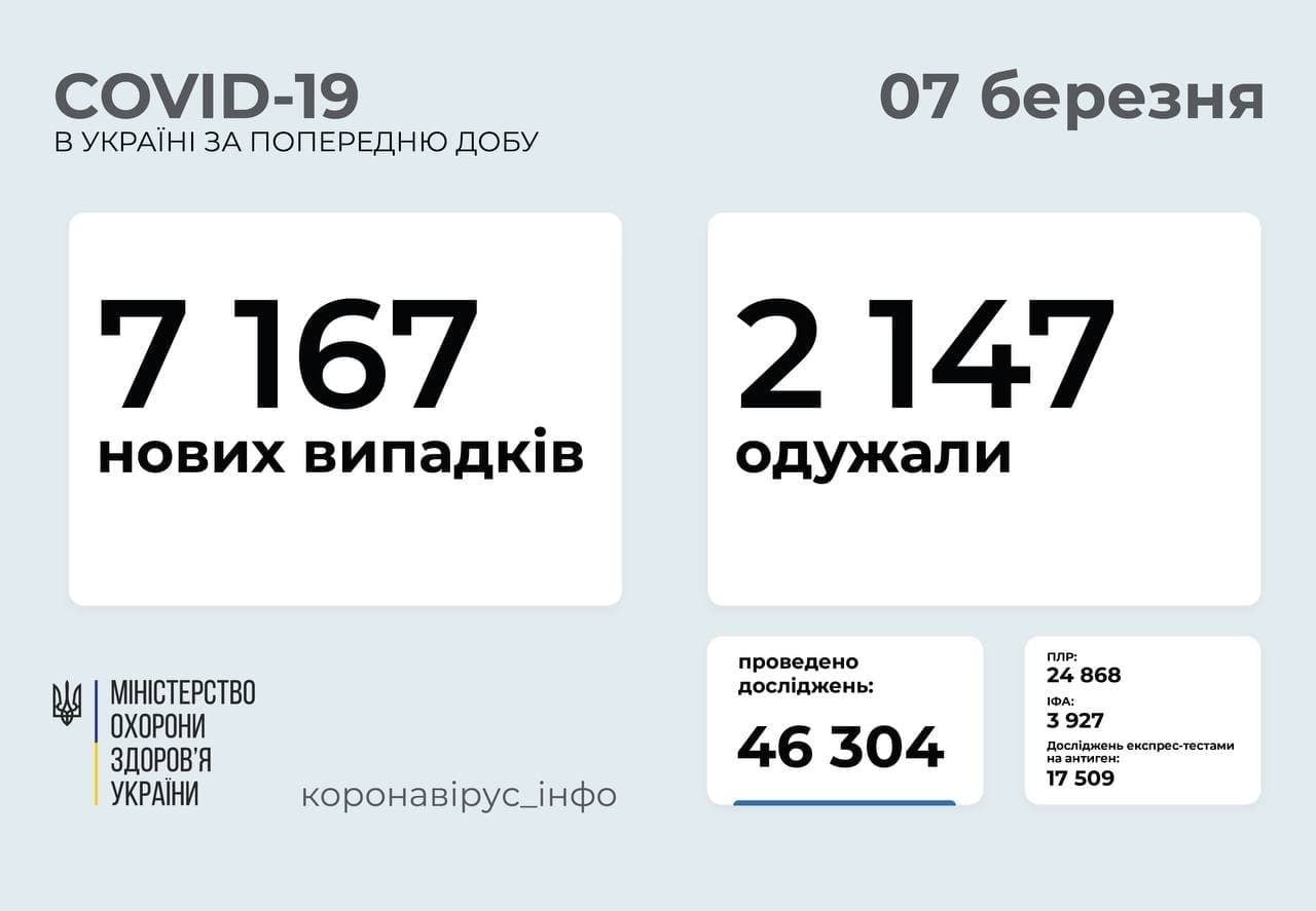 7 167 нових випадків коронавірусної хвороби COVID-19 зафіксовано в Україні станом на 7 березня 2021 року. Зокрема, захворіли 466 дітей та 172 медпрацівники.