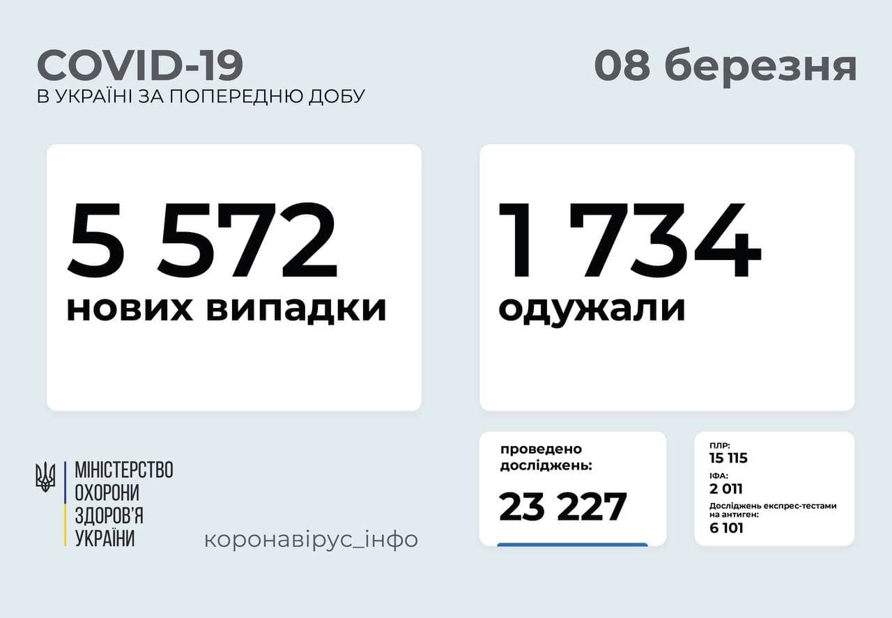 5 572 нових випадки коронавірусної хвороби COVID-19 зафіксовано в Україні станом на 8 березня 2021 року. Зокрема, захворіли 309 дітей та 123 медпрацівники.