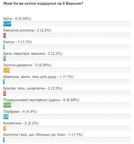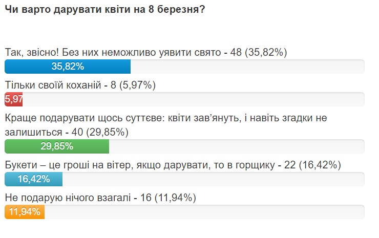 Станом на 16.30, 35% опитаних читачів переконана, що 8 Березня ніяк не можна з'являтися на очі жінці без квітів, а 30% - що краще дарувати якісь сттєвіші і довговічніші подарунки. Ще 17% надали перевагу квітам у горщику, замість букетів.
