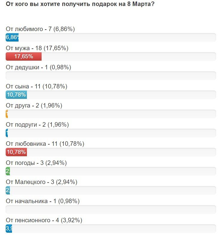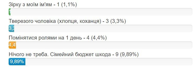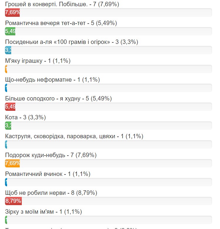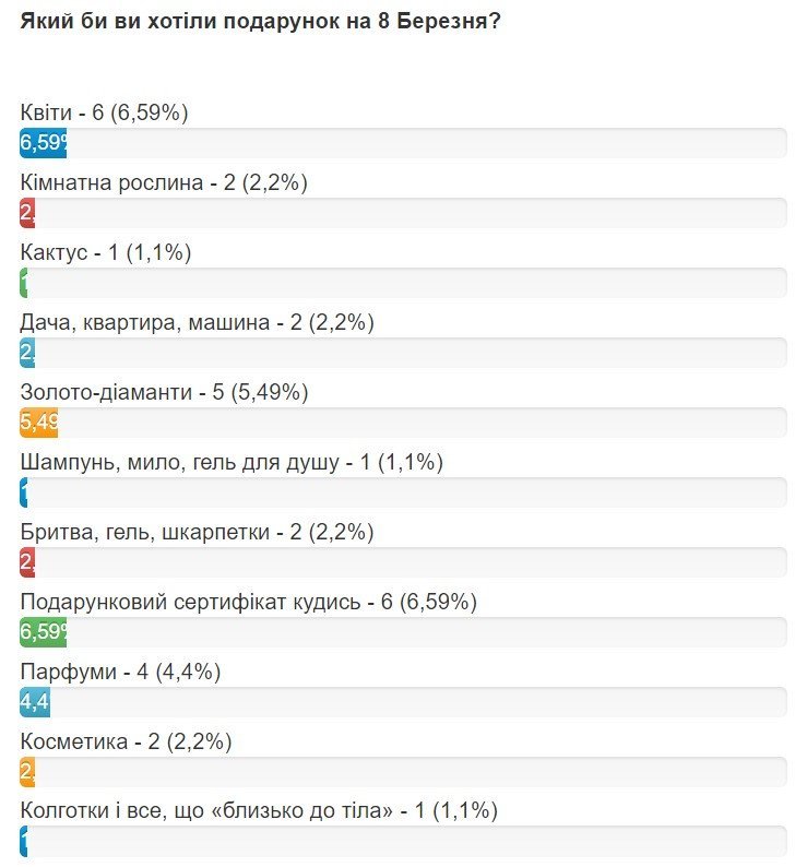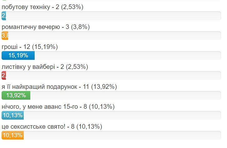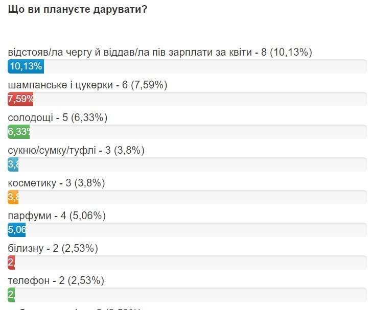 При цьому, більшість (15%) наших читачів чоловічої статі відповіли, що подарують жінкам гроші; 14% переконані, що вони самі і є найкращим подарунком; по 11% нічого не даруватимуть або вважають свято сексистським, і 10% відстояли довжелезні черги, за омріяним букетом.